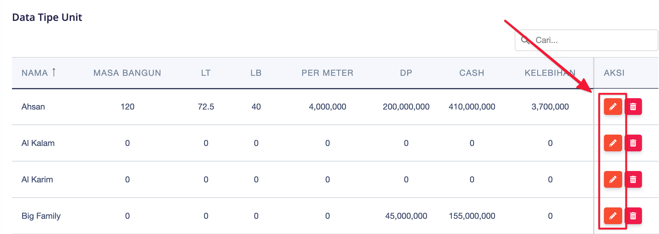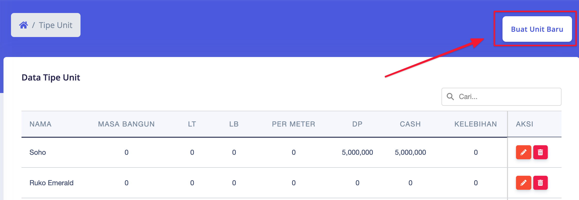 Masing-masing unit memiliki data-data yang berbeda seperti harga unit, luas unit, minimal DP unit dll. Di menu Tipe Unit inilah data-data tersebut diinputkan. Data-data itu nantinya akan digunakan dibanyak fitur lainnya, seperti fitur price calculation yang memerlukan data harga unit lalu fitur generate akad yang memerlukan data layout unit. Sehingga data-data pada setiap Tipe Unit ini harus tersedia agar proses pada fitur lainnya bisa berjalan.